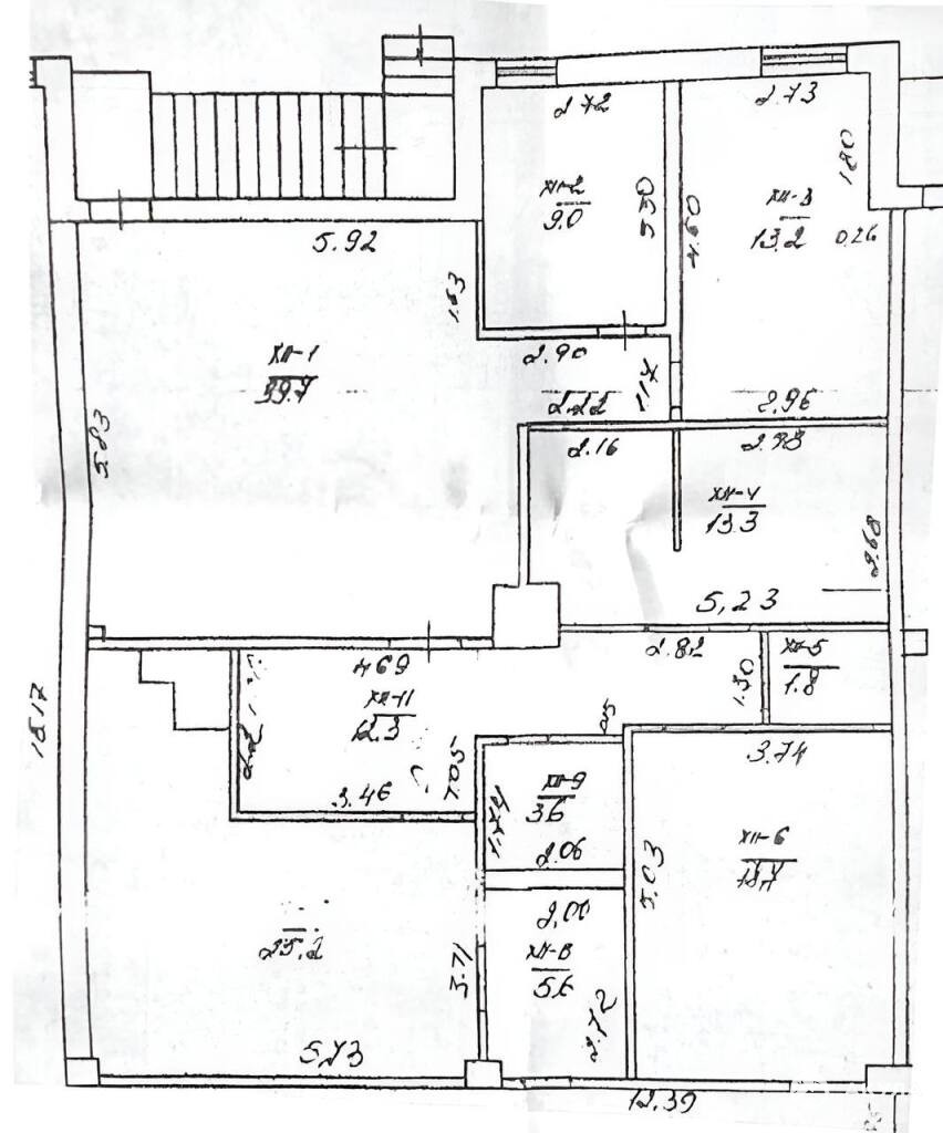 Состоит из большого хола 40м2, 6 офисов ( 9м2, 13м2, 13, 5 м2, 19м2, 25м2, 12м2 ) и нескольких небольших помещений, а так же санузел. Есть кухонная зона.
