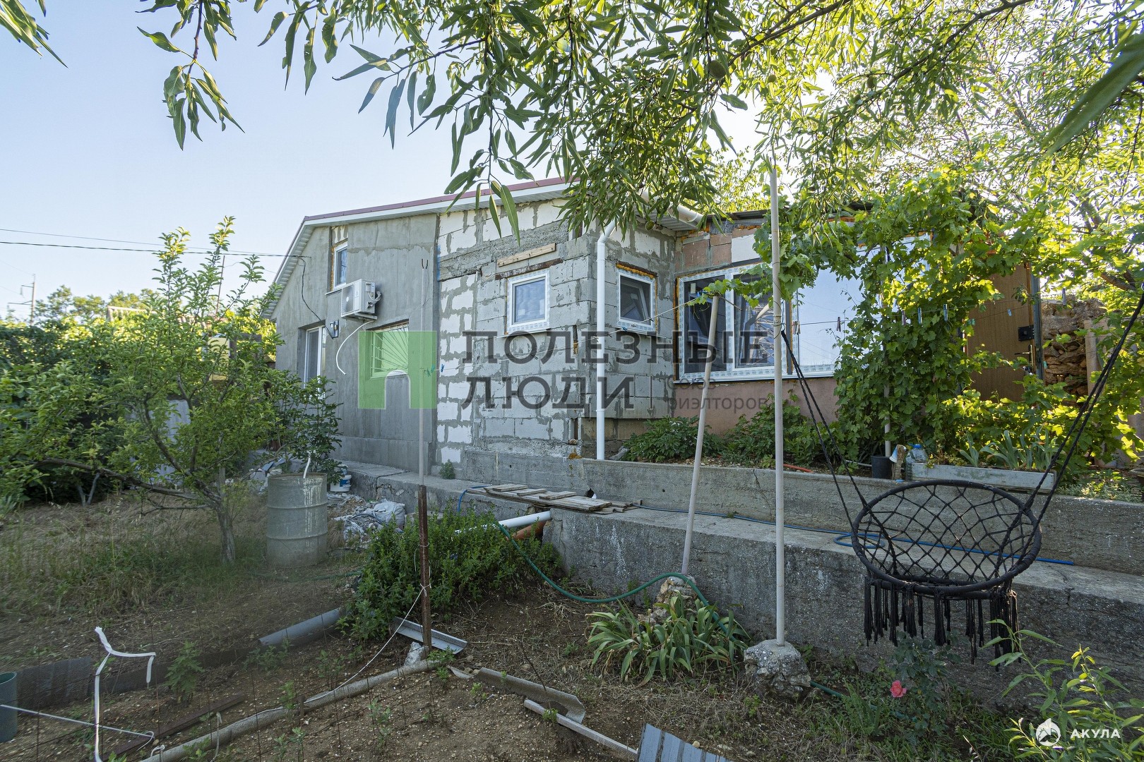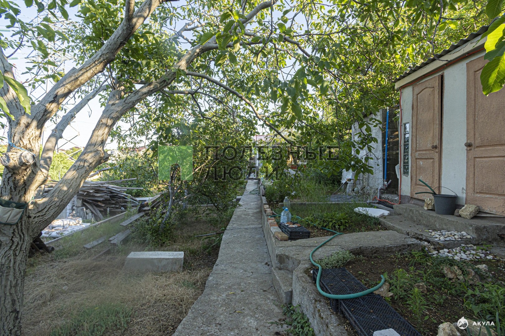 В пристройке пластиковая емкость для воды 1, 5 м3 с насосом. Фасадная часть участка составляет 40 метров. На участке плодовые деревья, розы.