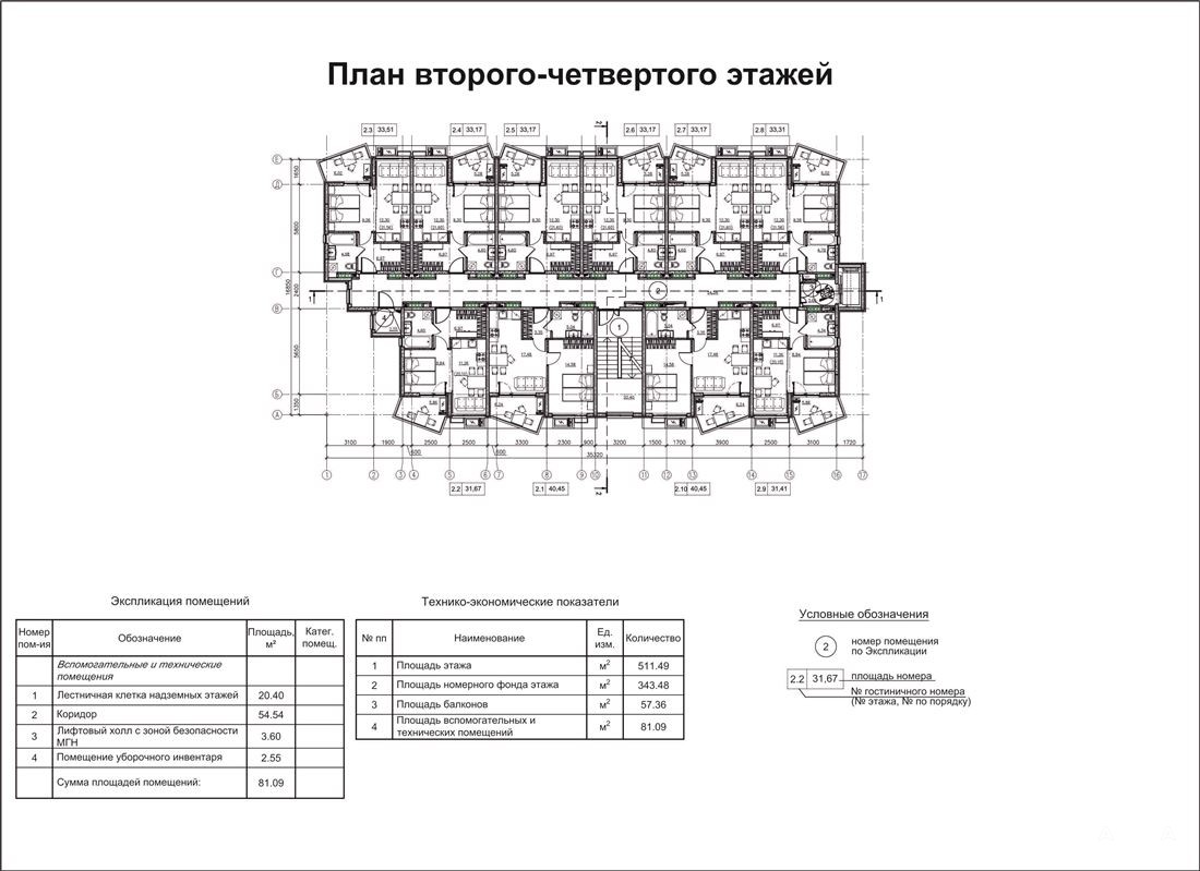 Со 2-го по 5-й этажи расположены гостиничные номера. Общее количество номеров – 40 шт. (по 10 номеров на этаже).