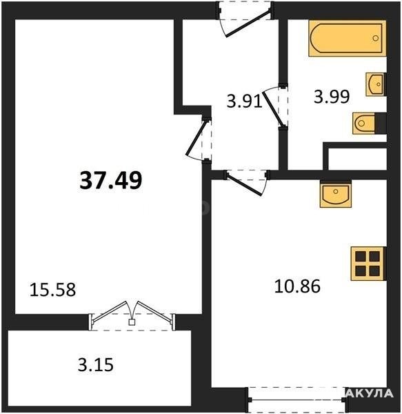 В продаже имеются квартиры в жилом комплексе "Семисчастье" премиум-класса. Общая площадь составляет 37, 49 кв.м., при этом кухня - 10, 86 кв.м. Высота потолков достигает 2, 7 м.