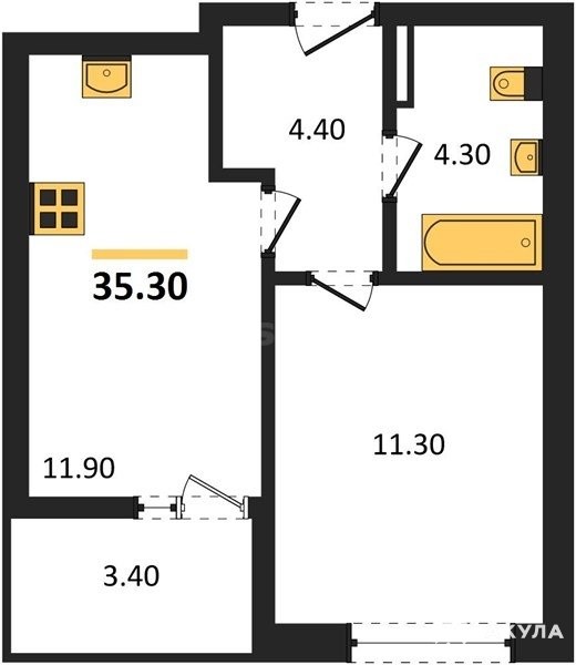 В продаже имеются квартиры в жилом комплексе "Дом на Маячной" премиум-класса. Общая площадь составляет 35, 3 кв.м., при этом кухня - 11, 9 кв.м. Высота потолков достигает 2, 8 м.