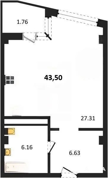 В продаже имеются студио-апартаменты с отделкой в жилом комплексе "Garden" премиум-класса. Общая площадь составляет 43, 5 кв.м., при этом жилая зона с кухней занимает 27.31 кв.м. Все окна выходят на одну сторону. В квартире есть лоджия и санузел. Высота потолков достигает 2.7 м.