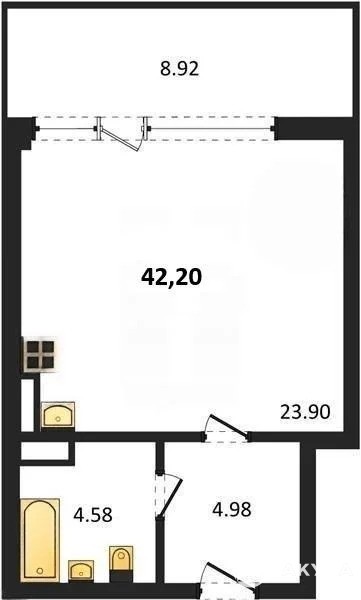 В продаже имеются студио-апартаменты с отделкой в жилом комплексе "Garden" премиум-класса. Общая площадь составляет 42, 2 кв.м., при этом жилая зона с кухней занимает 23, 9 кв.м. Все окна выходят на одну сторону. В квартире есть лоджия и санузел. Высота потолков достигает 2.7 м.