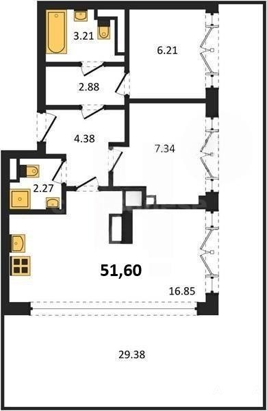 В продаже имеются квартиры в жилом комплексе "Олимпия 2.0" премиум-класса. Общая площадь составляет 51, 6 кв.м., при этом жилая зона с кухней занимает 16, 85 кв.м. Все окна выходят на одну сторону. В квартире есть лоджия и санузел. Высота потолков достигает 2.7 м.