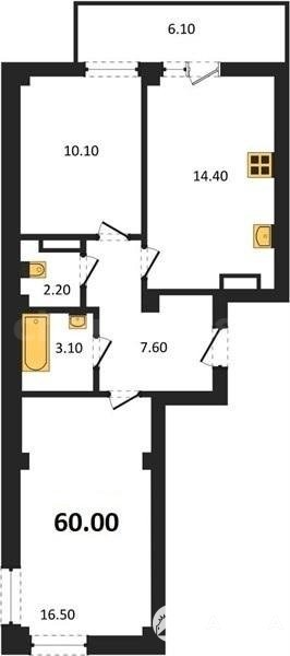 В продаже имеются квартиры в жилом комплексе "Доброгород" премиум-класса. Общая площадь составляет 60, 01 кв.м., при этом кухня - 14, 4 кв.м. Высота потолков достигает 2, 8 м.