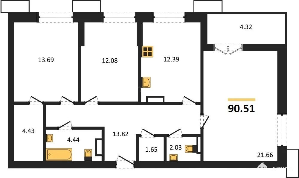В продаже имеются квартиры в жилом комплексе "Семисчастье" премиум-класса. Общая площадь составляет 90, 51 кв.м., при этом кухня - 12, 39 кв.м. Высота потолков достигает 2, 7 м.