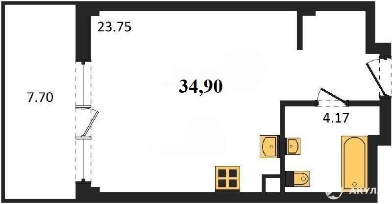 В продаже имеются студио-апартаменты с отделкой в жилом комплексе "Garden" премиум-класса. Общая площадь составляет 39, 6 кв.м., при этом жилая зона с кухней занимает 23, 75 кв.м. Все окна выходят на одну сторону. В квартире есть лоджия и санузел. Высота потолков достигает 2.7 м.
