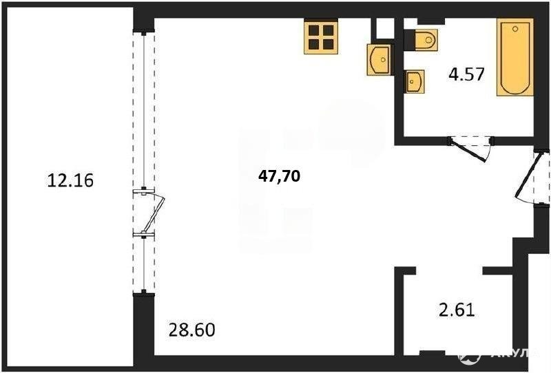 В продаже имеются студио-апартаменты с отделкой в жилом комплексе "Garden" премиум-класса. Общая площадь составляет 47, 7 кв.м., при этом жилая зона с кухней занимает 28, 6 кв.м. Все окна выходят на одну сторону. В квартире есть лоджия и санузел. Высота потолков достигает 2.7 м.