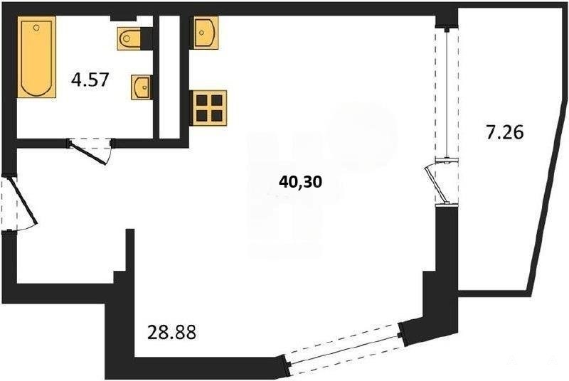 В продаже имеются студио-апартаменты с отделкой в жилом комплексе "Garden" премиум-класса. Общая площадь составляет 40, 3 кв.м., при этом жилая зона с кухней занимает 28, 88 кв.м. Все окна выходят на одну сторону. В квартире есть лоджия и санузел. Высота потолков достигает 2.7 м.