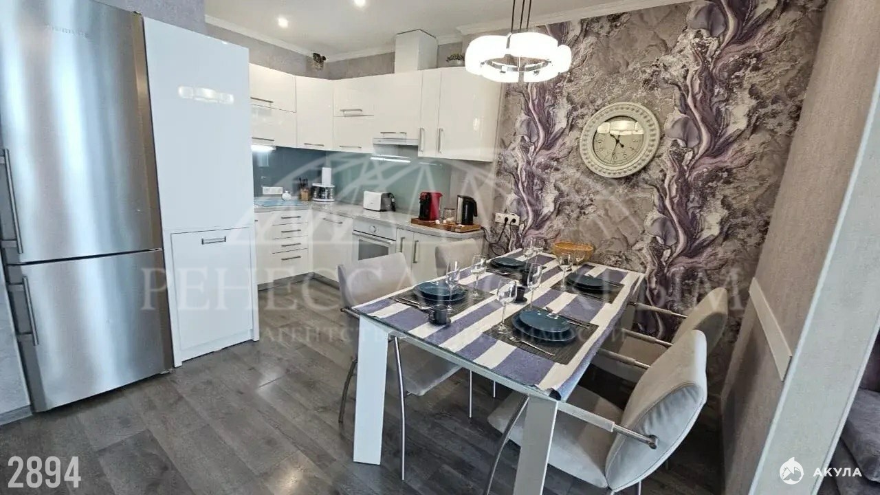 - Современная бытовая техника: большой телевизор, холодильник, стиральная и посудомоечная машины, индукционная пита, духовой шкаф, микроволновая печь, кофе-машина, чайник.